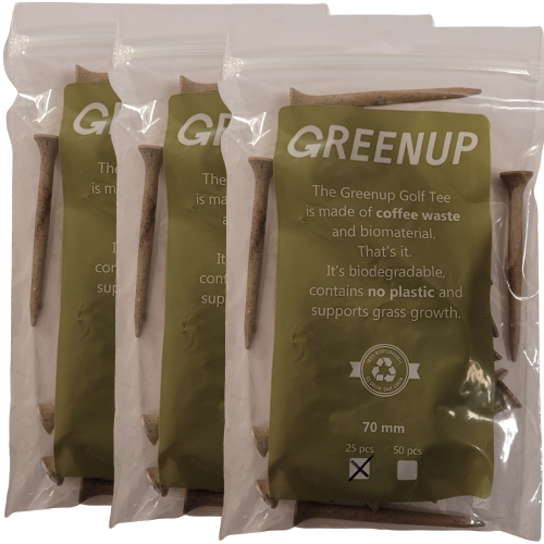 Greenup har udviklet en golf tee lavet af genanvendt kaffegrums og biomateriale, der gør den 100% biologisk nedbrydelig. Den indeholder ingen plastik, og hvis din tee går i stykker kan du lade den ligge, da materialerne i den fungerer som gødning for græsset. Ved at anvende Greenup golf tee er du med til at holde golfbanerne grønne i fremtiden.